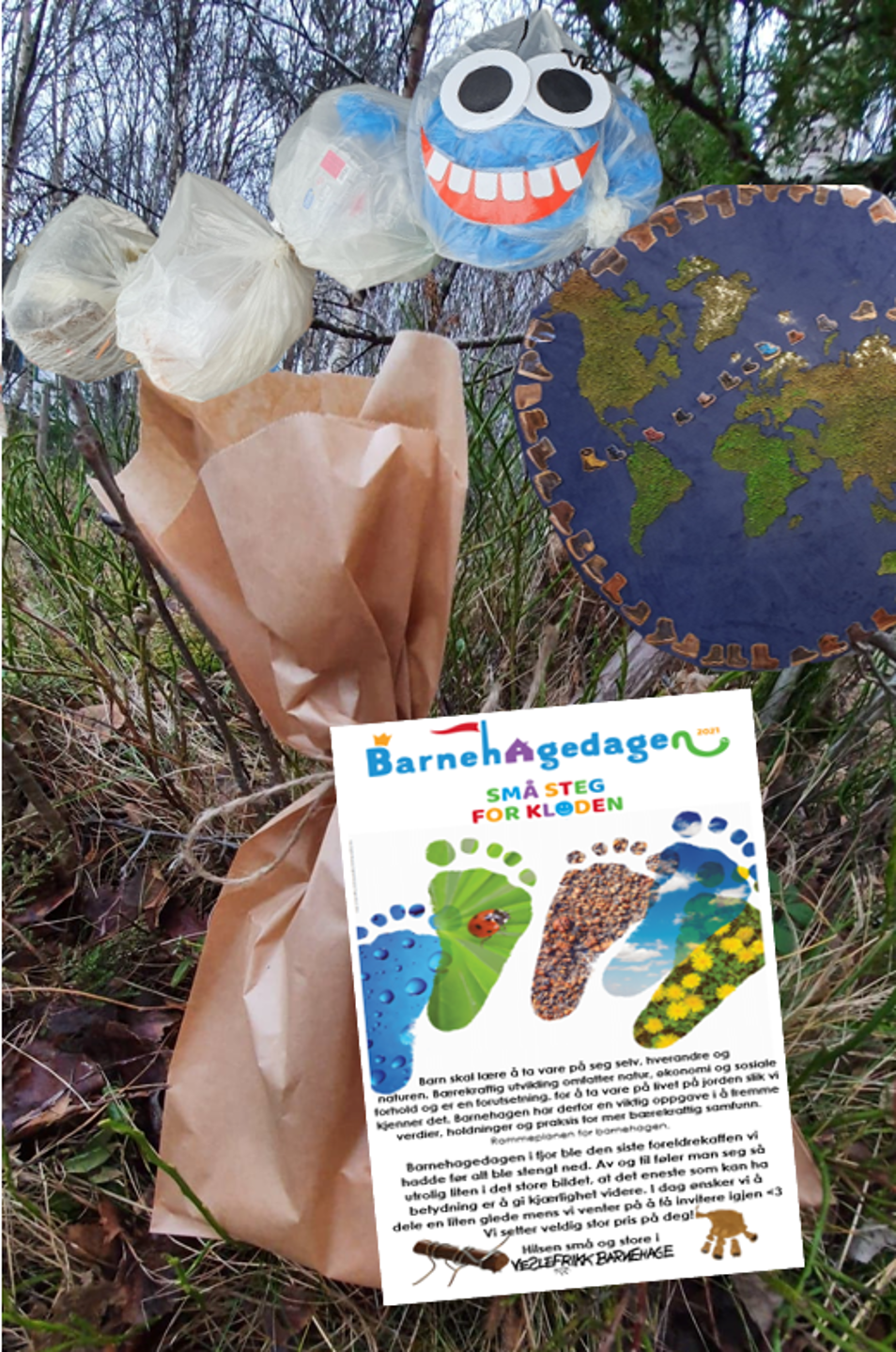 Når barna gikk på tur i forige uke, plukket de med seg alt søppel de fant på sin vei. Dette laget de om til en kjempelarve, som nå henger på utsiden. Bærekraftig - noe som kan bli til noe annet :-)