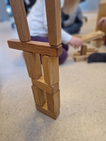 Månegjengen var de første som fikk prøve klossene. Vi så først på hele kisten, barna luktet på den. "Det lukter tre!", var det en som sa og alle var helt enige!