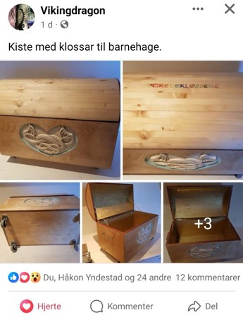 I posten i går, kom det en stor pakke fra Askøy. Der bor min svoger, Ronny Søvik. Han er bla kunstner, har eget firma og lager "viking" suvenirer også jobber han på en båtfabrikk med å lage interiør til båter. Ronny har sendt barnehagen noe han hadde laget selv. Ei stor skatteliste, med utskjæringer og full av eikeklosser i ulike størrelser som barna kan bygge med! Alt sammen en gave til barnehagen og barna - jammen er vi heldige!